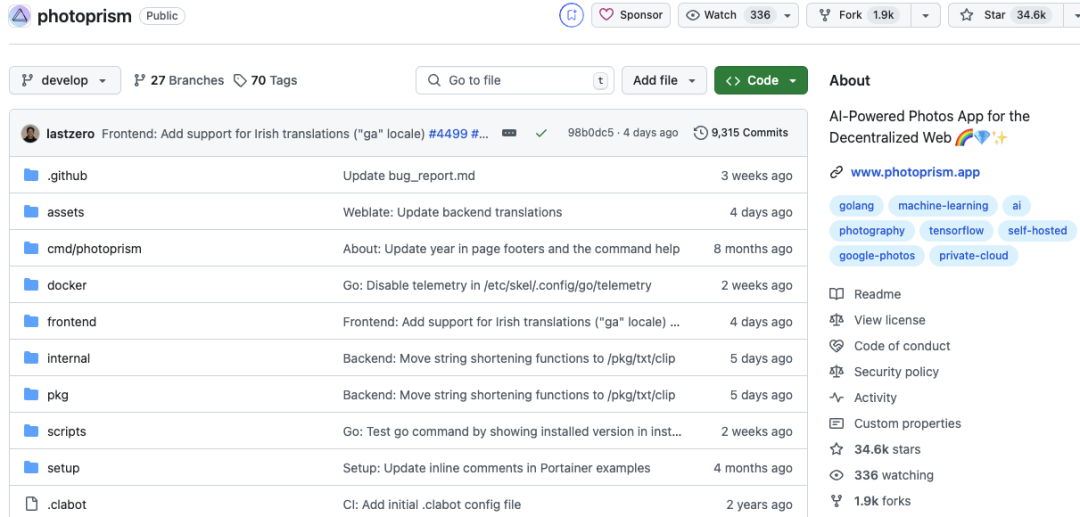 同时采用 Go 语言开发,响应极快。而 PhotoPrism 在GitHub开源以来,已获得了近 34,600 颗标星,并且还在不断更新维护中,稳定性和功能性得到了众多用户的青睐。