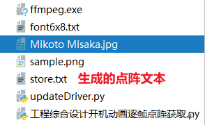 本文为利用python代码实现从视频到点阵的快速生成,方便为单片机的动画提供点阵资源。从视频获取连续帧图使用的是ffmpeg。相应的资源文件在附件提供。