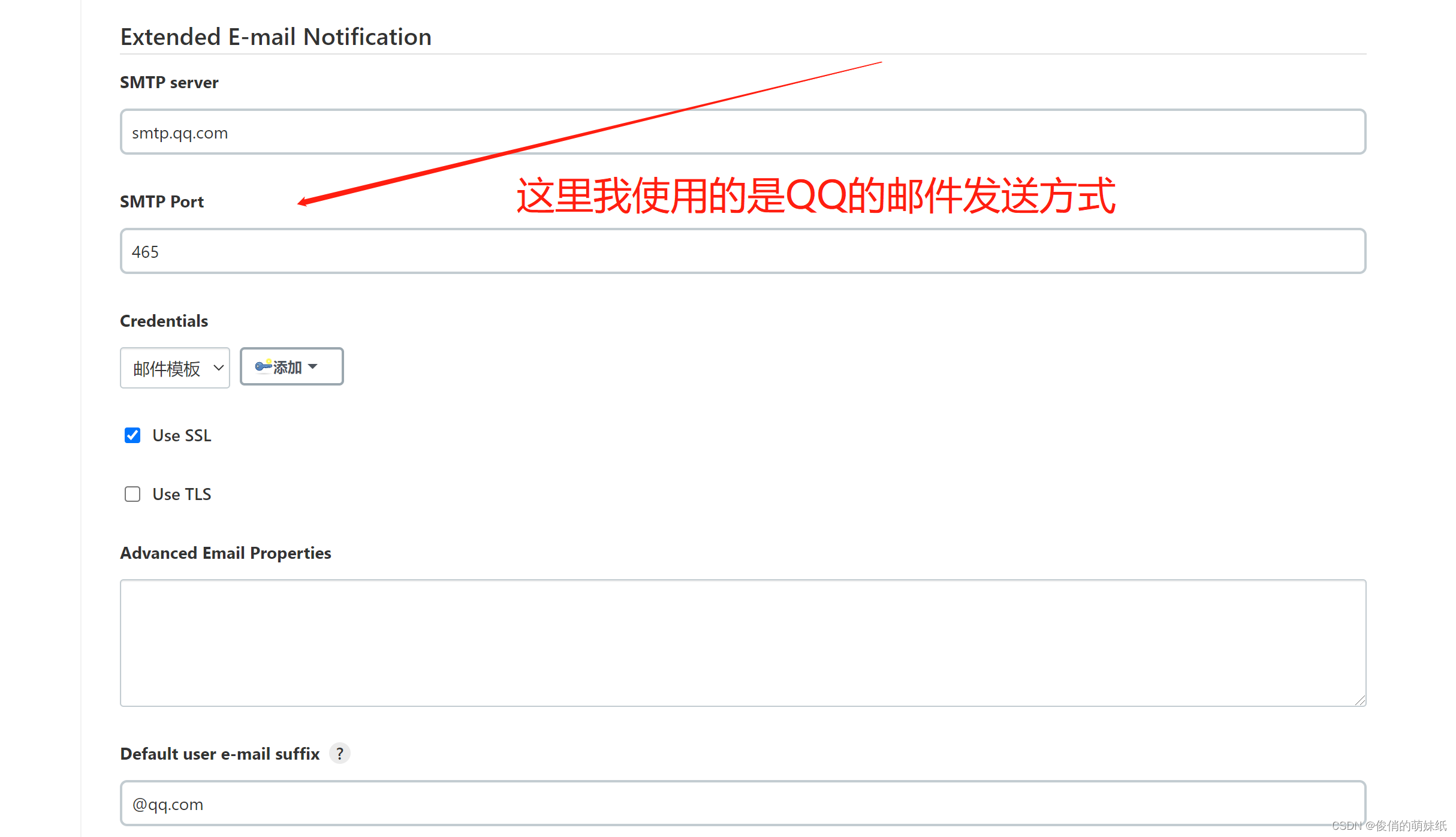 进入后找到Extended E-mail Notification配置项,此时就需要设置参数了,我这里使用的是QQ邮箱服务器,也可以使用其他的邮件发送方式比如163等等