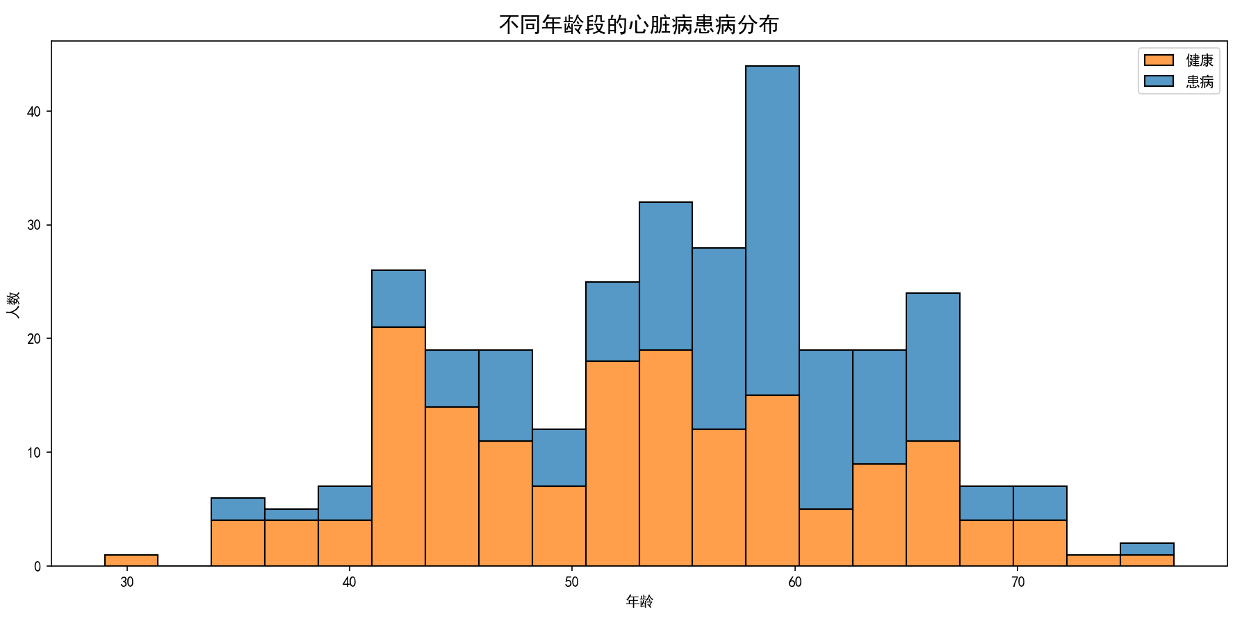 可以从图中看出来50-70这个年龄段是心脏病人群的高发年龄