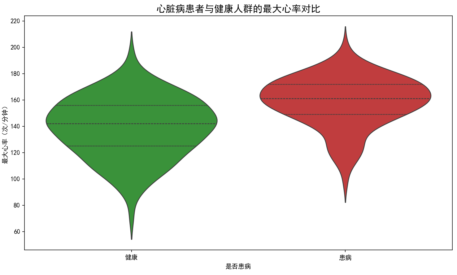 患病人群的最大心率普遍高于健康人群,分布集中在160次/分钟