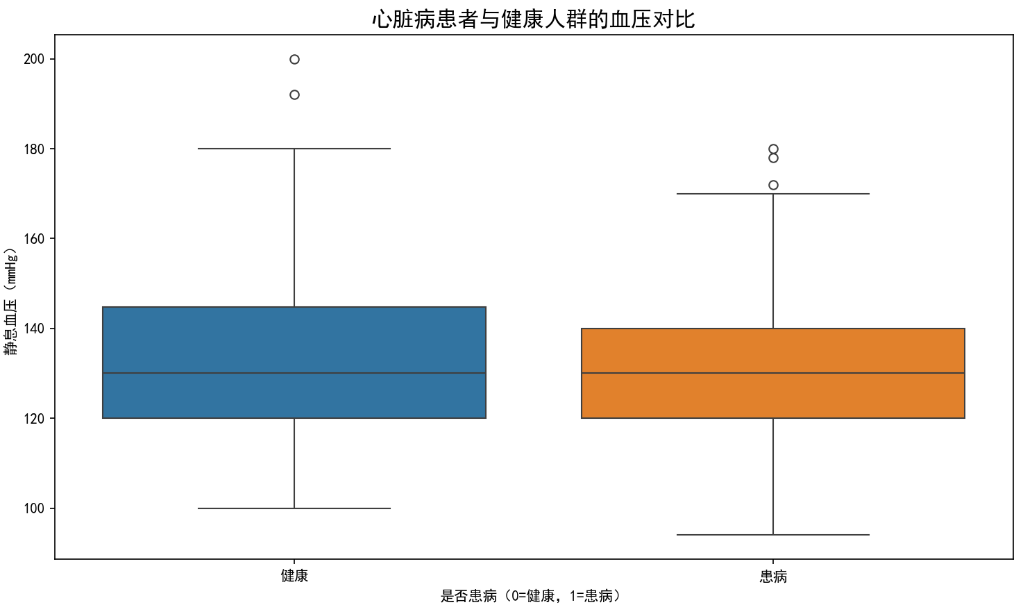 发现患病患者的血压高压最高值低于健康人群,但均值是差不多的,血压可能与是否患病的关系不大