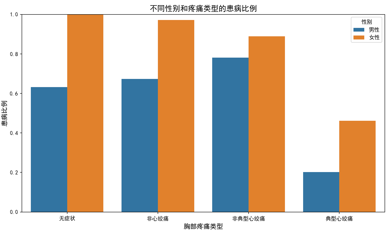 患病比例总体上仍是女性高于男性,但在与疼痛类型的关系上男性与女性显现出较大不同,男性的胸部疼痛类型与患病比例与所有性别疼痛患病比例一致,均为非典型心绞痛患病比例最大。但女性在无症状与非心绞痛的疼痛类型中也有很高的患病率。这个是值得重点探究原因的。