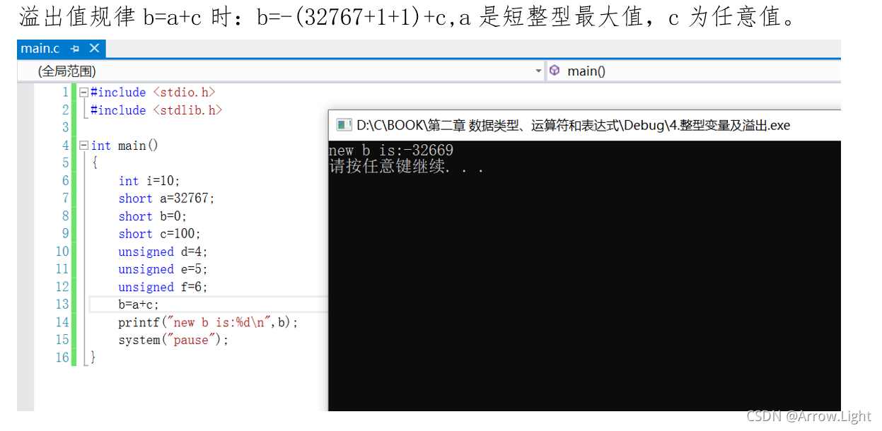 溢出值规律b=a+c时:b=-(32767+1+1)+c,a是短整型最大值,c为任意值。