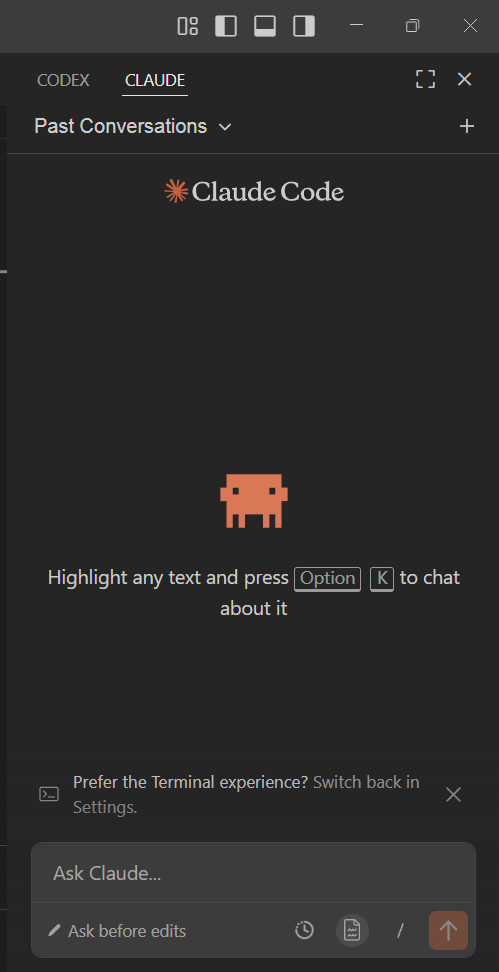 Ctrl+Shift+P (Windows/Linux) 打开 VS Code 命令面板,搜索 Claude Code: Open in Side Bar就能在主边栏打开,发送到侧边栏即可。
