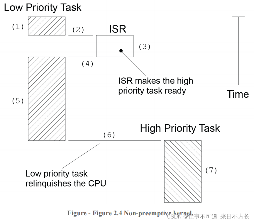 非抢占式内核的调度也称为协作多任务处理;任务相互协作,共享CPU。异步事件仍然由isr处理。ISR可以使更高优先级的任务准备好运行,但是ISR总是返回到被中断的任务。只有当当前任务放弃CPU时,新的更高优先级的任务才会获得对CPU的控制。