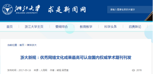 此外,浙江大学发布的《浙江大学优秀网络文化成果认定实施办法(试行)》中将优秀网络文化成果纳入学校科研成果统计、各类晋升评聘和评奖评优范围。《办法》中规定,在《人民日报》、《光明日报》和《求是》杂志刊发,并形成重大网络传播的作品,可申报认定为等同于国内权威学术期刊刊发。其中较大网络传播是指作品被不少于10 家主流媒体及其网站、“两微一端”和重要商业网站及其“两微一端”刊发、转载;微信公众号刊发的作品,阅读量不少于10 万;头条号刊发的作品,阅读量不少于40 万。