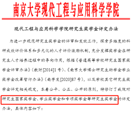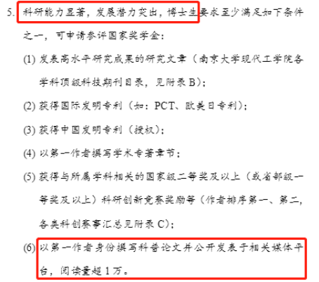 南京大学发布的研究生奖学金评定办法中规定,除了常见的发表高水平研究成果、申请专利、获得国家级奖项这类可参评国家奖学金外,在最后一条确有规定只要博士生以第一作者身份撰写科普论文并公开发表于相关媒体平台,且阅读量超1万,就可以申请参评国家奖学金。