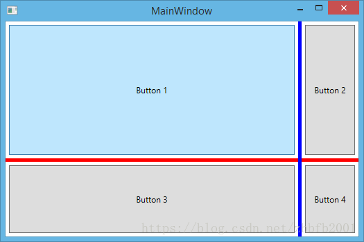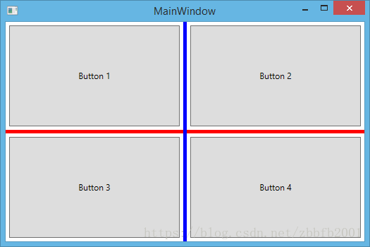 <Window x:Class="WpfApplication1.MainWindow" xmlns="http://schemas.microsoft.com/winfx/2006/xaml/presentation" xmlns:x="http://schemas.microsoft.com/winfx/2006/xaml" Title="MainWindow" Height="350" Width="525"> <Grid> <Grid.RowDefinitions> <RowDefinition /> <RowDefinition Height="Auto" /> <RowDefinition /> </Grid.RowDefinitions> <Grid.ColumnDefinitions> <ColumnDefinition /> <ColumnDefinition Width="Auto" /> <ColumnDefinition /> </Grid.ColumnDefinitions> <Button Margin="5">Button 1</Button> <Button Grid.Row="0" Grid.Column="2" Margin="5">Button 2</Button> <Button Grid.Row="2" Grid.Column="0" Margin="5">Button 3</Button> <Button Grid.Row="2" Grid.Column="2" Margin="5">Button 4</Button> <GridSplitter Grid.Row="1" Grid.Column="0" Grid.ColumnSpan="3" Height="5" Background="Red" HorizontalAlignment="Stretch" VerticalAlignment="Center" /> <GridSplitter Grid.Row="0" Grid.Column="1" Grid.RowSpan="3" Width="5" Background="Blue" VerticalAlignment="Stretch" HorizontalAlignment="Center" /> </Grid> </Window>