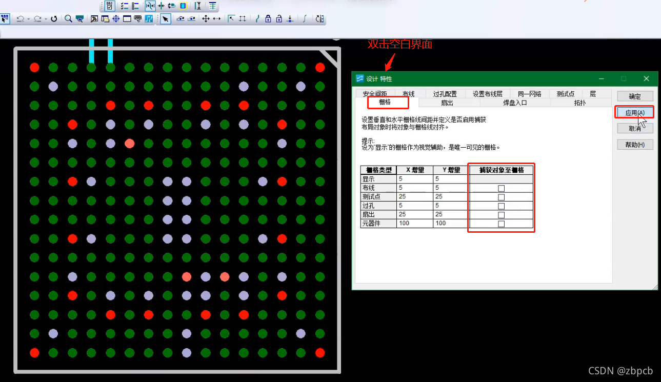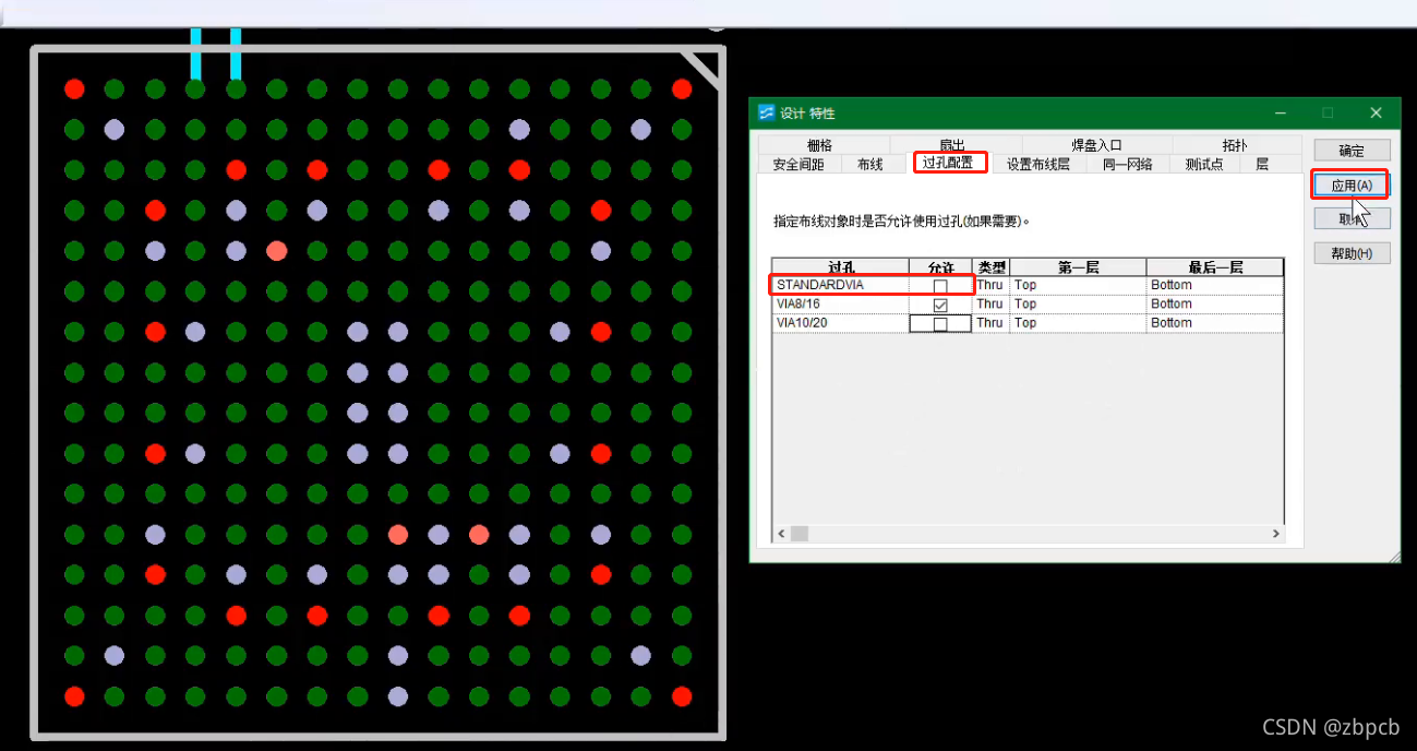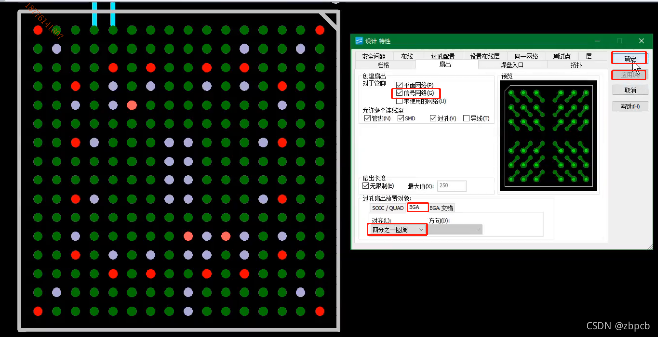 完成过孔和安全间距的配置后,切换到router界面,双击空白页面,弹出“设计特性”窗口,在“栅格”界面,取消√“捕获对象至栅格”;在“过孔配置”界面,取消√默认过孔,并选择一个配置过孔(只允许选择一个);在“扇出”界面,勾选√“信号网络”并选择BGA下的“四分之一圆周”,点击“应用”并“确定”。操作如下图所示: