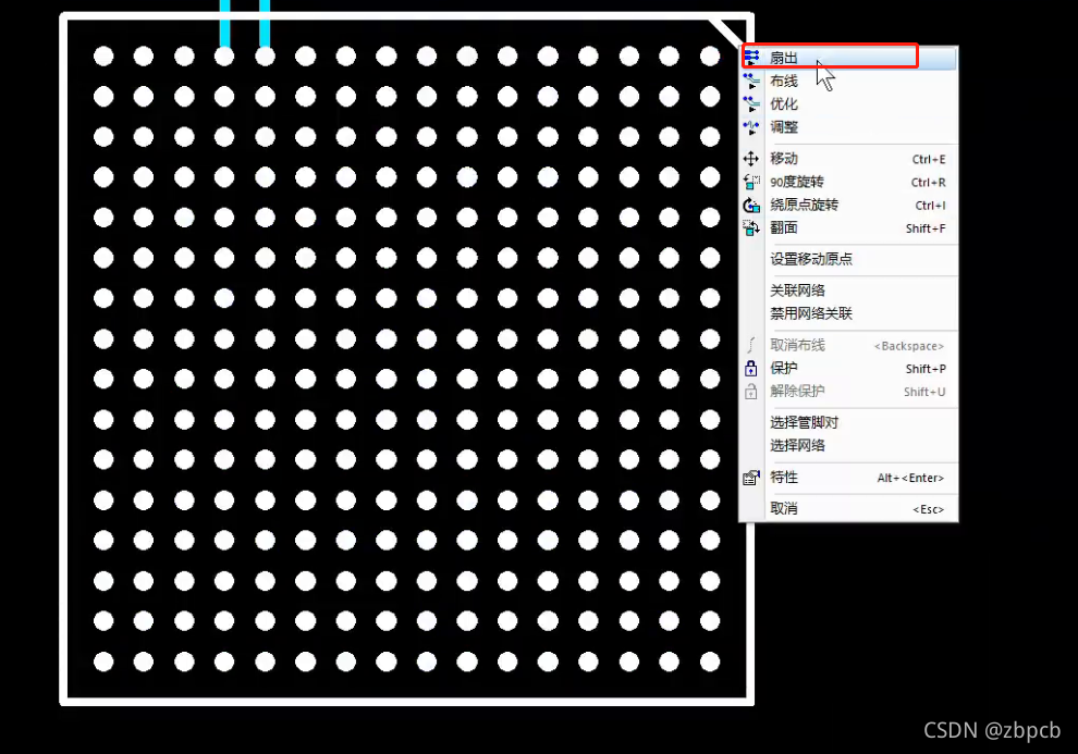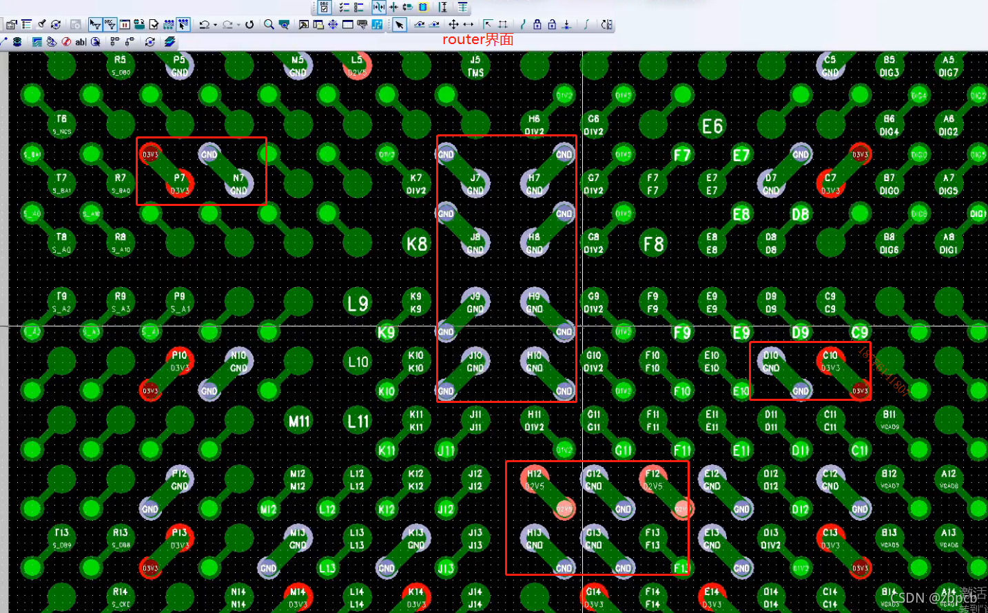 设置完成后,切换回router界面,进行BGA的扇出后,便能看到电源线和地线都进行12mil线宽的加粗,其他网络线宽没有变化。如下图所示: