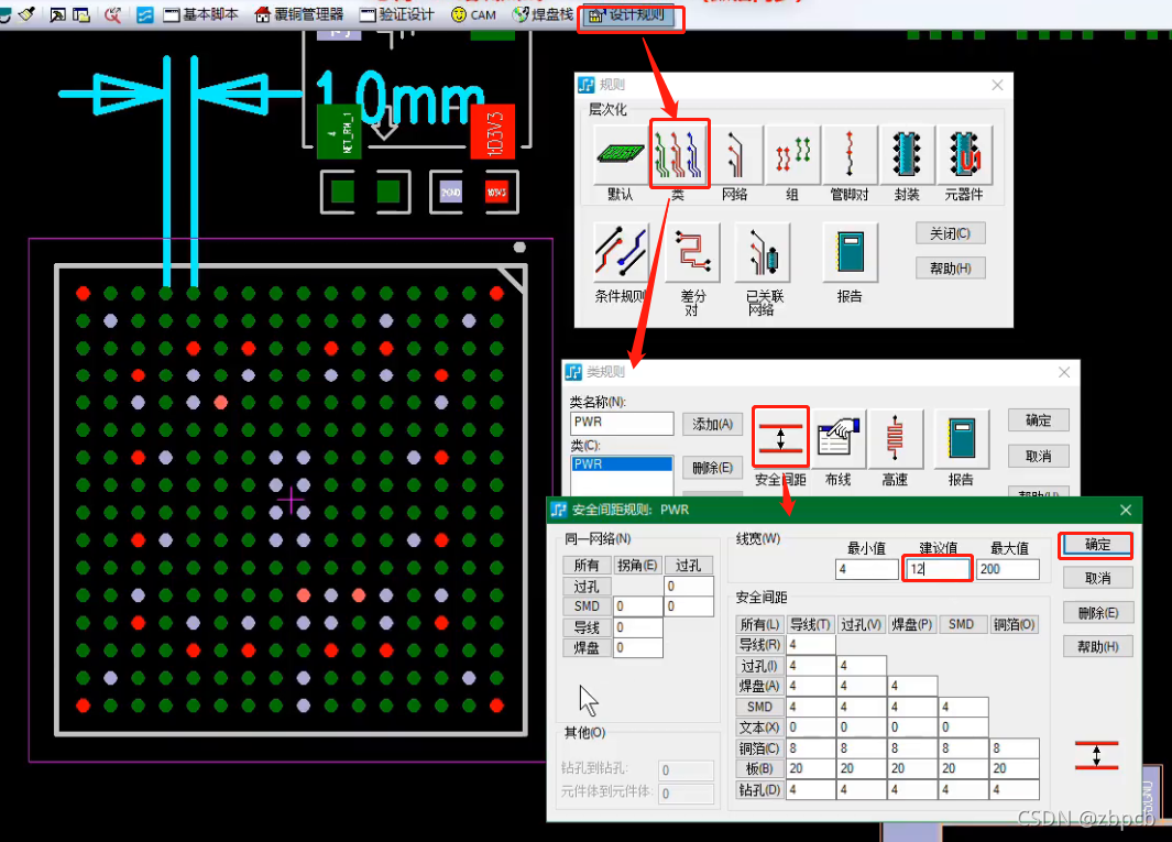 电源线和地线都需要加粗走线,如果扇出后,再进行调整,会显得过于麻烦。因此下面讲解在扇出前就先将电源线和地线设置加粗的方法。回到layout界面,选中BGA中的电源网络和地网络后,单击右键选择“建立类”,弹出对应窗口,修改名称并确定。然后点击“设计规则”→“类”→“安全间距”,在“安全间距”界面,只用修改线宽的“建议值”即可,其他参数不变。操作如下图所示: