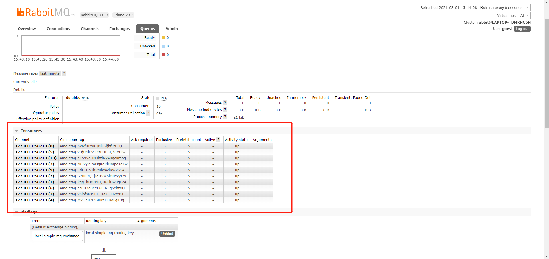 接下来是等待固定的 TTL:在这里设定的是 10s,当消息入死信队列 10s 后,将自然而然的将消息路由到下一个中转站,即真正的消费监听处理队列进行处理:判断该笔交易订单号是否已经付款,如果否,则失效之!