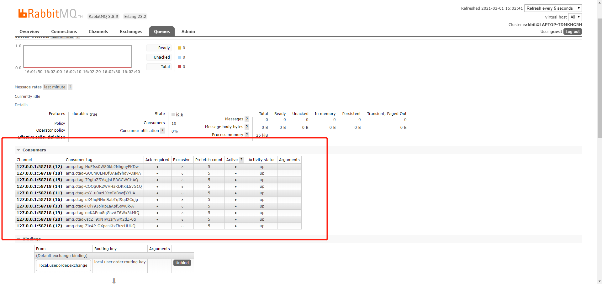 可以将该服务跑起来,然后发起 controller 的用户下单请求,会发现消息入死信队列后不会立马被消费,等待 10s 会,消息会被路由到真正的消费队列中进行处理,这一现象可以在 MQ 的后端控制台应用中看到!