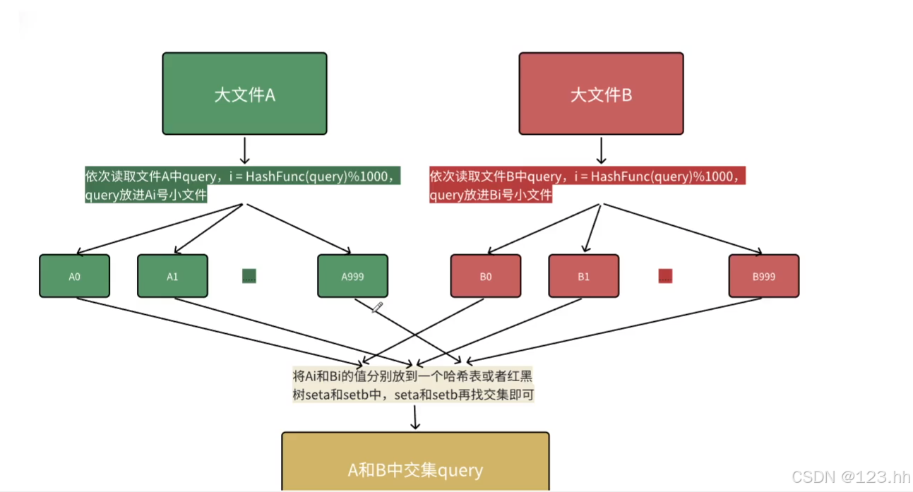这里有一种新的解决方案:将文件中所有query查询语句利用哈希函数将转为整形值再模上1000得到每个query语句的映射值;再给出000个小文件并且每个小文件依次编号,将query放进其映射值与文件编号相同的小文件;最后再将这些小文件的值依次放到set中,然后再对两个大文件的编号相同的小文件的set进行对比就能找到相同的部分;