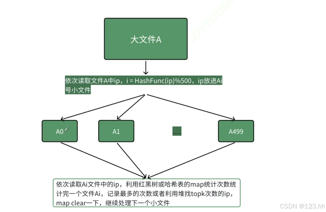 解决方案:依次读取大文件中的ip值并转为整形模上分为的小文件个数,将相同的ip放到相同编号的小文件中;之后再读取小文件中的ip放到一个map<string,int>中int统计相同ip出现的个数,最后统计出现次数最多的ip就能找出了;
