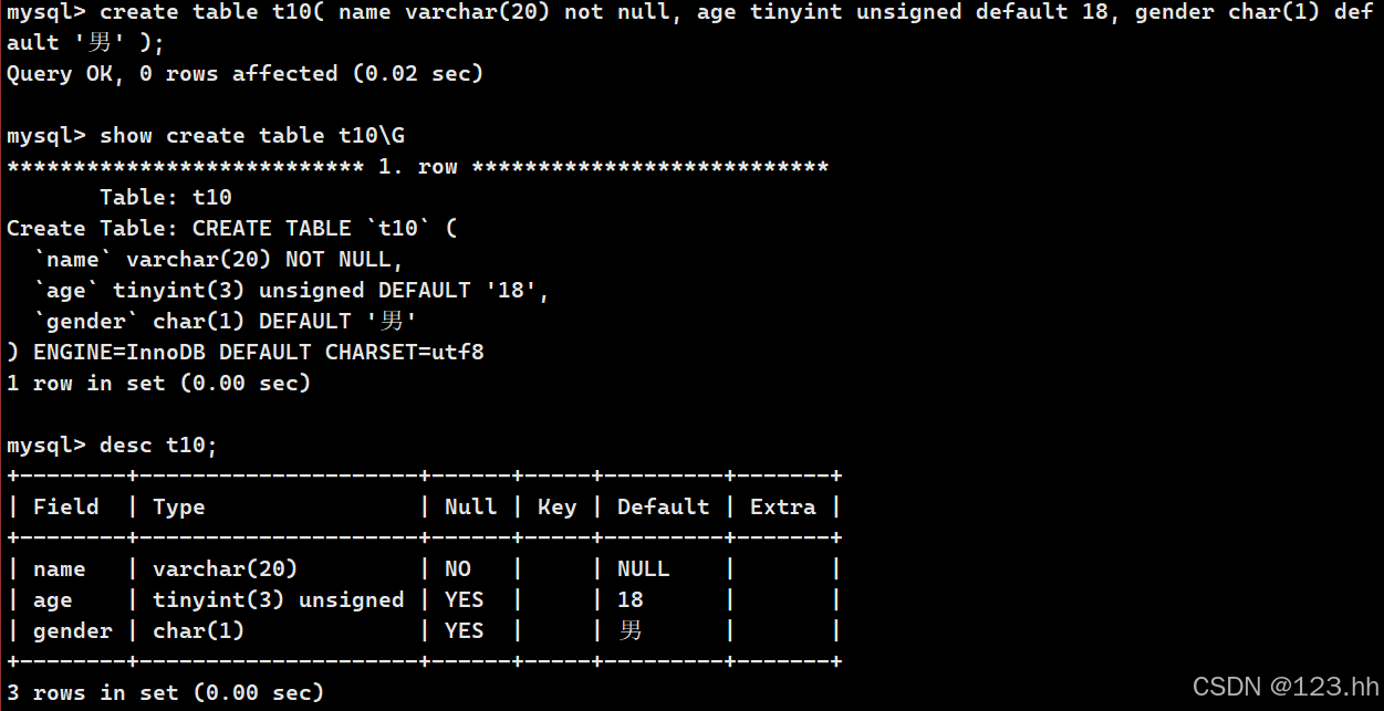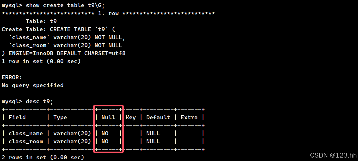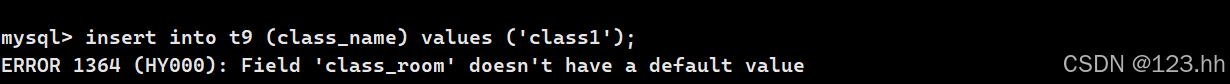 这里报错为没有缺省值,是因为没有设置值时默认使用缺省值,而没有设置缺省值,缺省值默认为null,但是Null约束归定了不能为空,所以是报错没有设置缺省值;