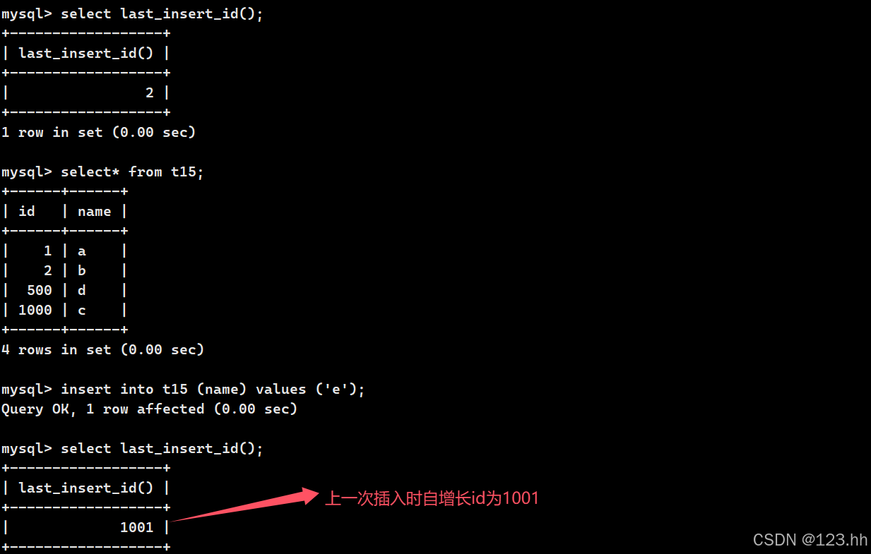 通过 函数 select last_insert_id() 查询上一次插入时的自增长值(批量插入后查询,查出的是第一个插入的值)