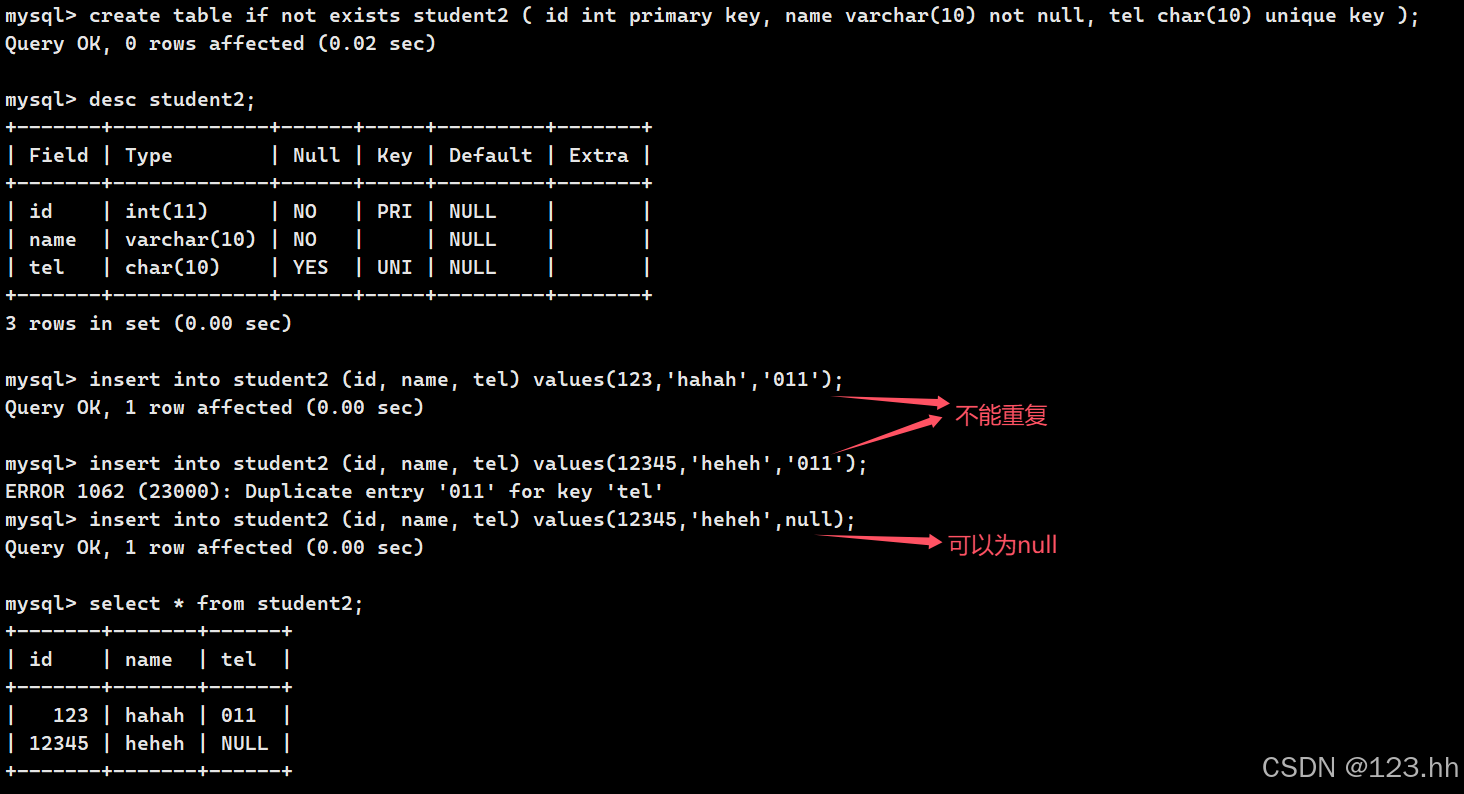 unique key:所约束的属性列的各个值必须唯一,可以为空;