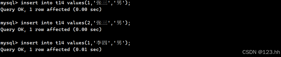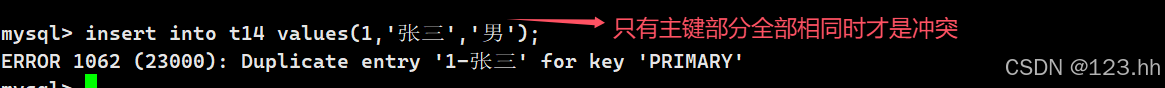 插入数据时也不能插入空并且主键的属性整体不能相同