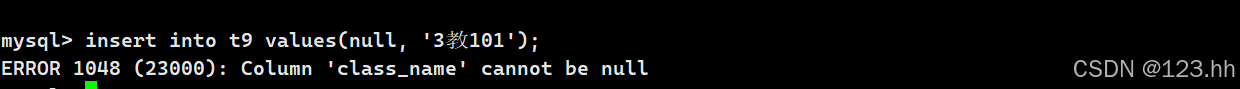当某一个属性的Null约束是not null而且没有设置default时,我们知道没有设置default时,默认值给null,但是此时是不允许插入null的,所以此时相当于没有设置default,就会报错。