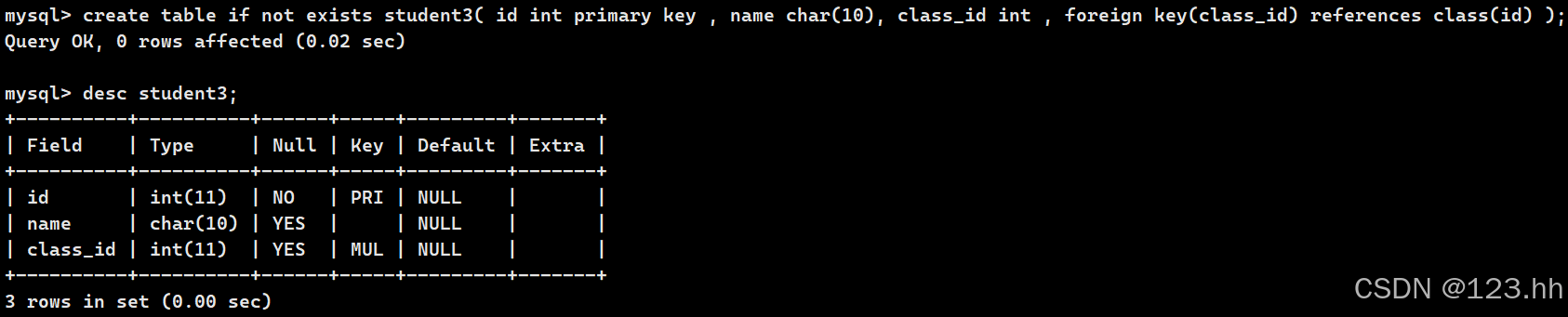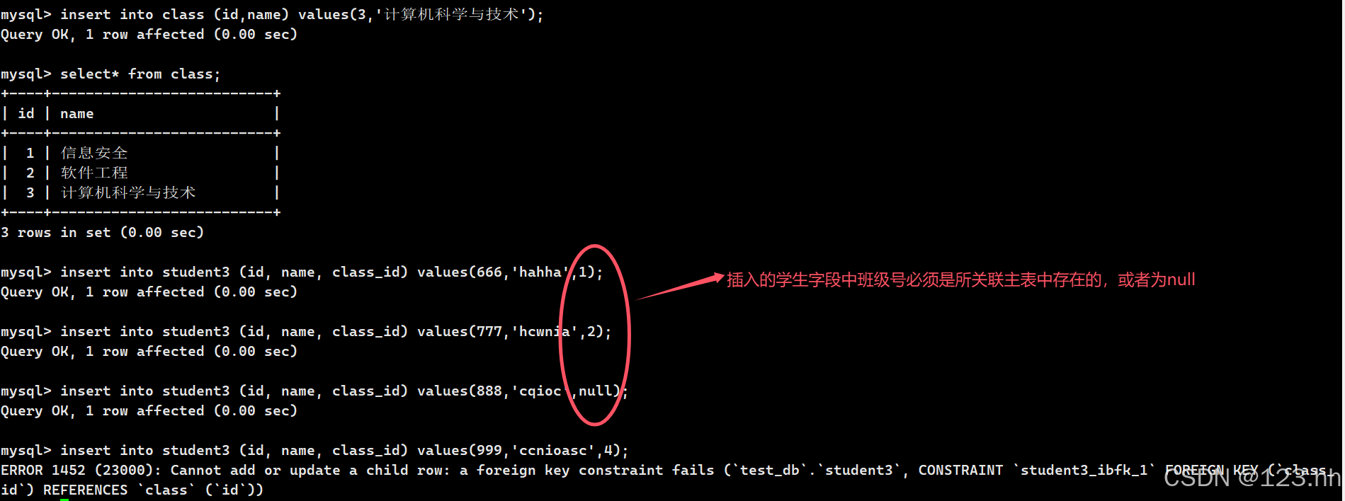 给主表插入数据,表示能收学生的班级号有哪些;再给学生表插入数据,合乎情理的是插入数据时对应班级号的一列班级表中id列存在的值或者是null表示还没有给这个学生分配班级: