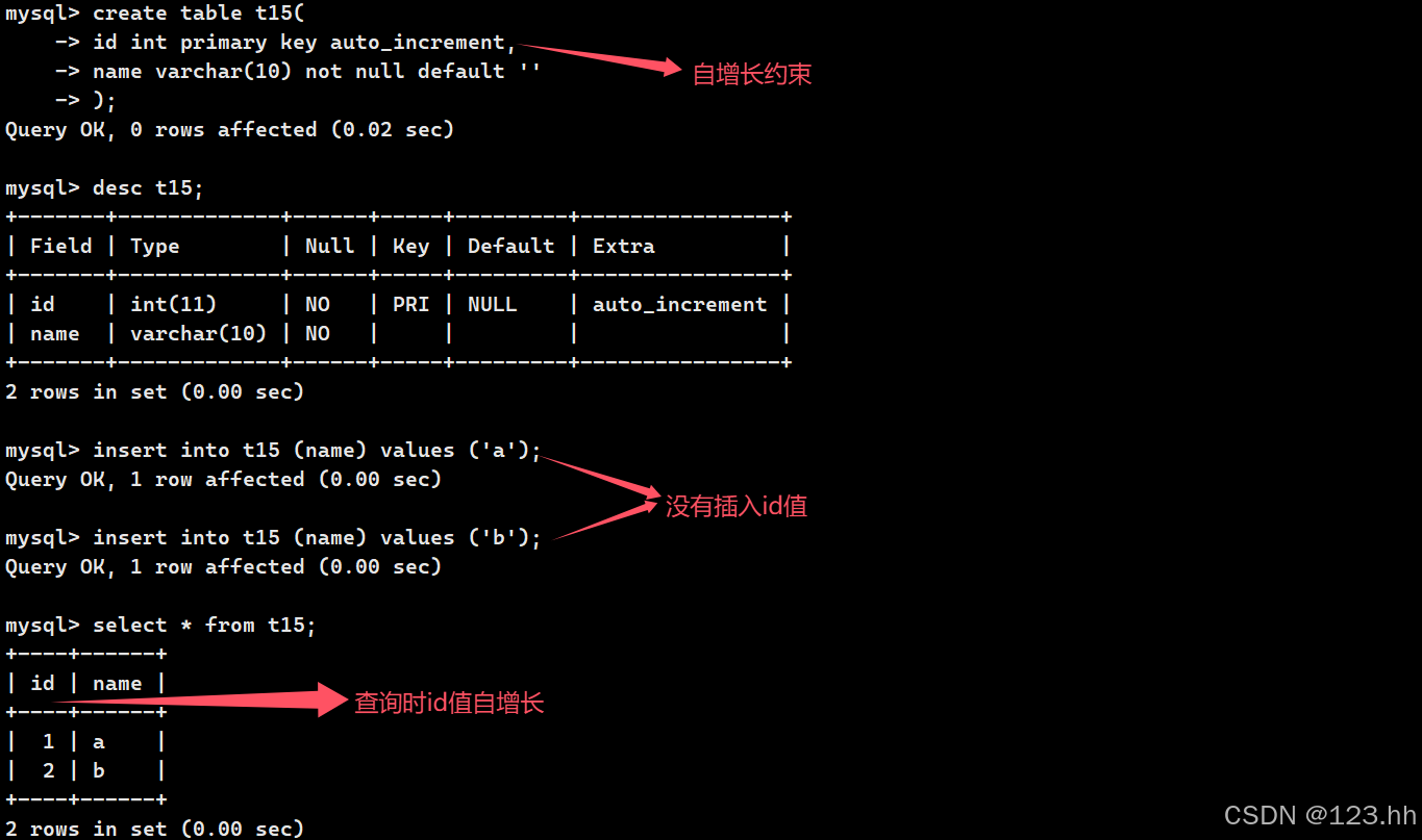 ###定义:auto_increment,设置了自增长的属性列在进行插入数据时,若是没有给值,系统会默认给一个这个属性列中最大的值+1的值,得到一个新的不同的值;自增长通常配合主键一起使用作为逻辑主键。