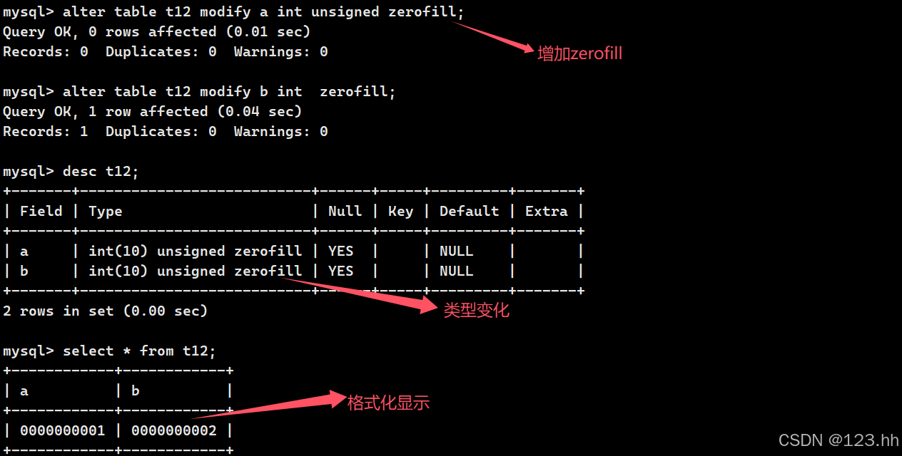a后面是10,b后面是11(符号位),这些数字都是为了zerofill准备的,当设置了zerofill之后,查看数据就会格式化输,前面不够补0,若是zerofill比数据还要短,那么就显示原数据