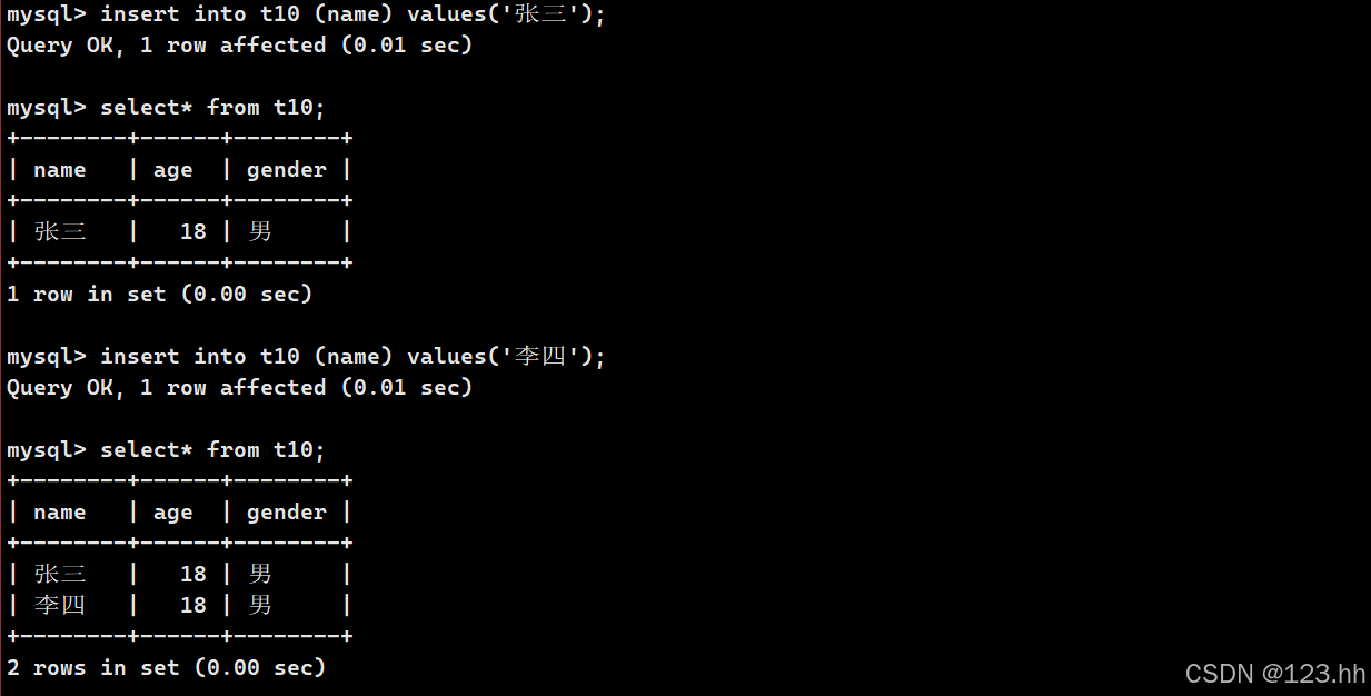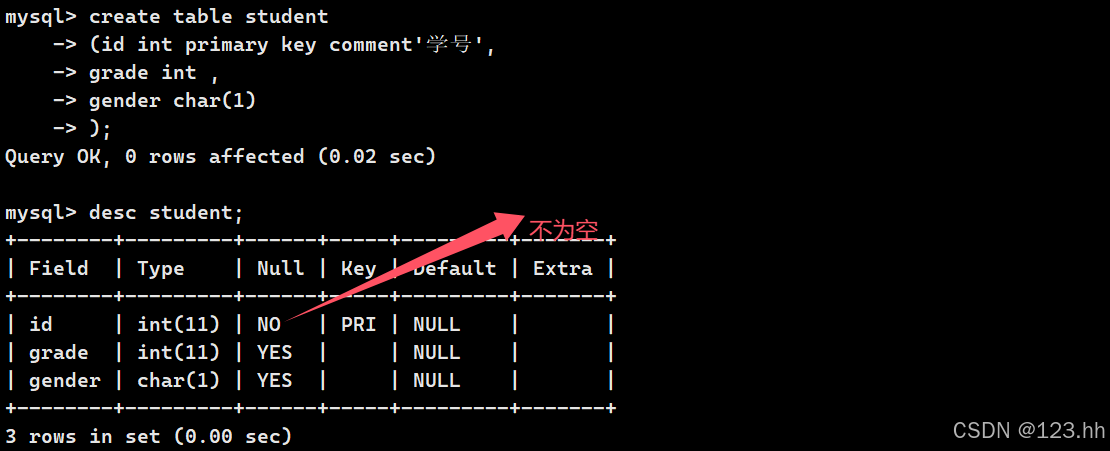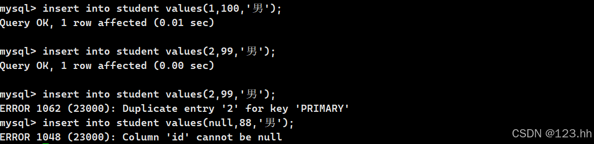 Null约束管理的是真正插入数据了,若是有一个属性NUll是not null,那么就不能插入null;也就是说NUll触发约束时是显示插入数据时: