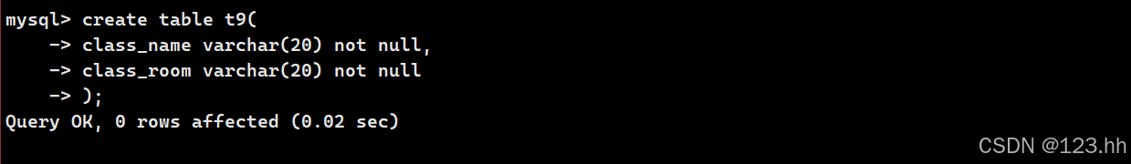 创建一个班级的表,里面包含两个属性,一个是班级名,一个是班级教室,要上课这两个都不是空,所以设置not null约束,那么插入数据时就不能有空的: