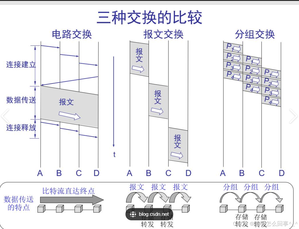 若要传输大量数据并且传送时间远大于连接建立时间就使用电路交换;报文交换和分组交换不需要预先分配传输带宽,在传输突发数据时可以提高网络信道的利用率。由于一个分组的长度往往远远小于一个报文的长度,因此分组交换的时延比报文交换的小,也更加灵活
