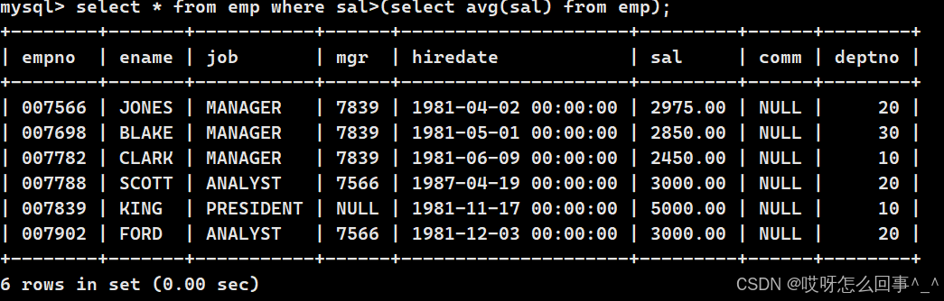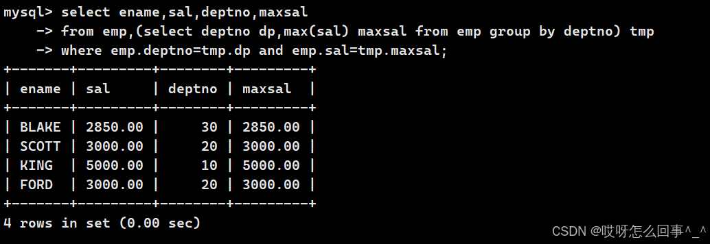 在from里面创建一临时表tmp,这个表用来计算部门的平均工资,这样就能和emp表里面相同部门的不同员工比较工资了