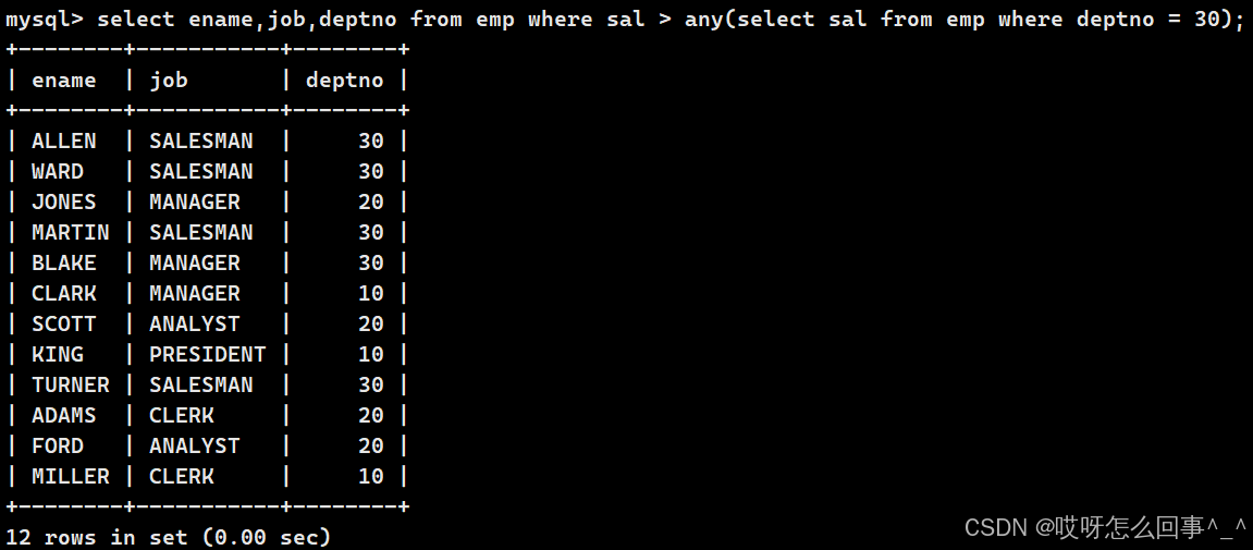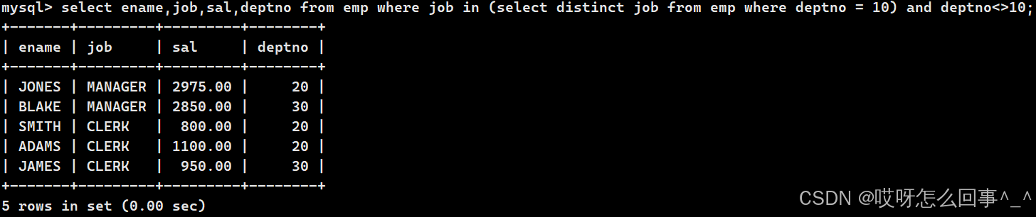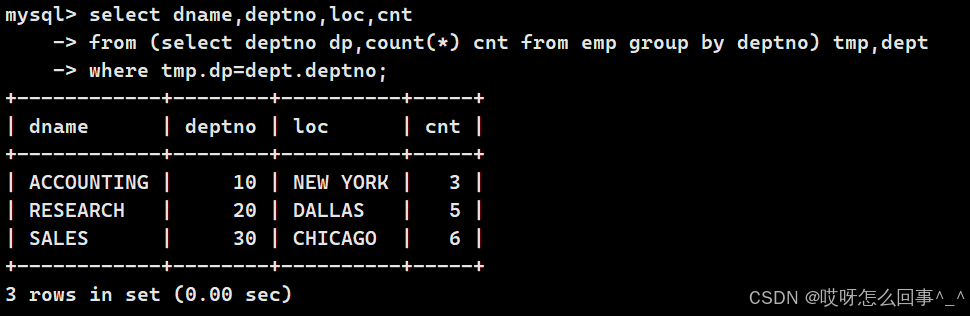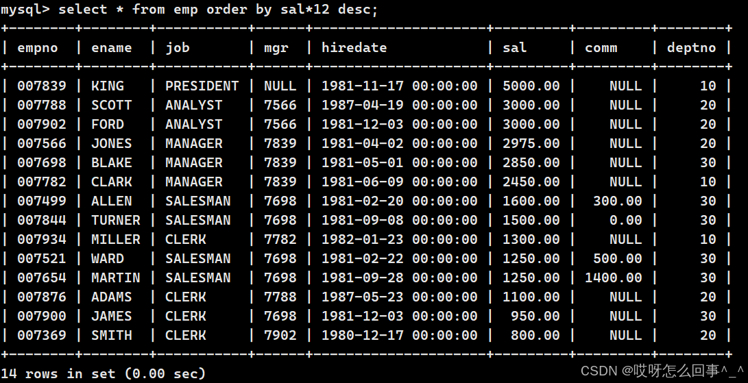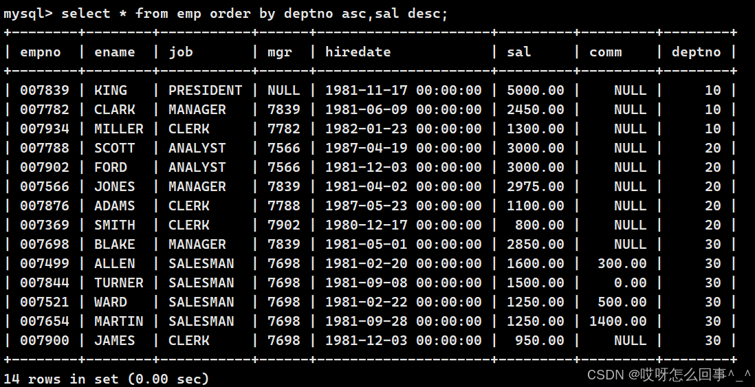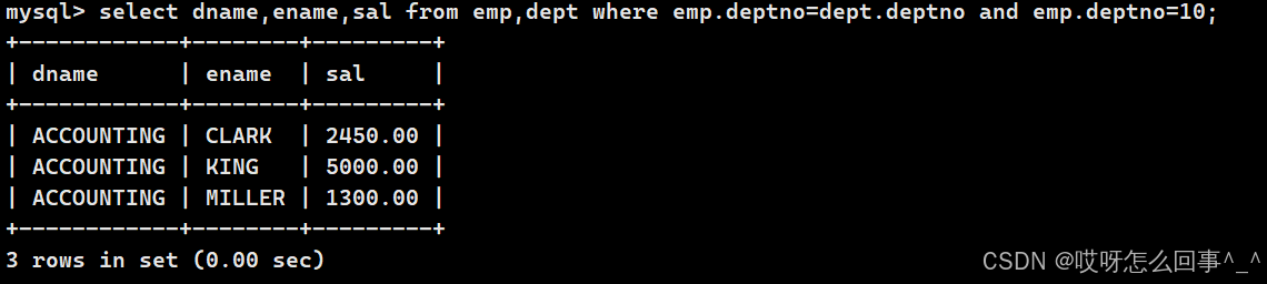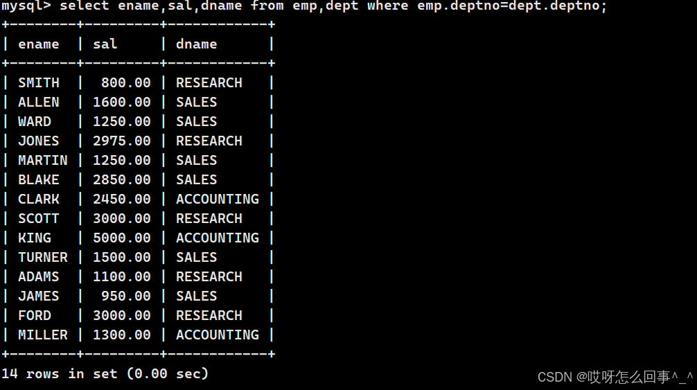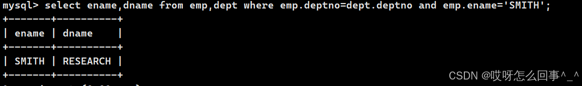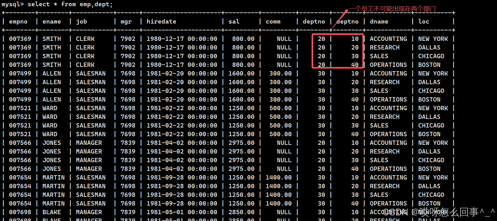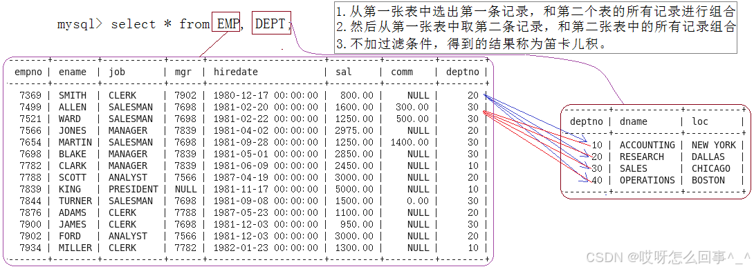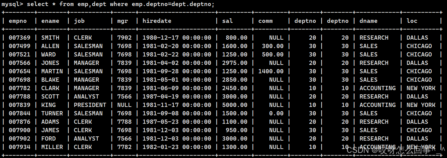 原理:select* from emp,dept;相当于将这两张表作笛卡尔积形成一个新的表,这个表有很多错误数据,比如一个员工的deptno有很多个,此时只需要找到两张表中相同的,就是正确的deptno所在元组