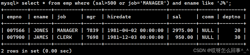 1、查询工资高于500或岗位为MANAGER的雇员,同时还要满足他们的姓名首字母为大写的J