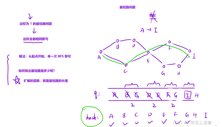 概述:最短路径问题就是边权为一的路径问题,每一次往外走一步步数加上边权,走到目的地步数最少的就是最短路。这种问题一般需要层次遍历来进行辅助,因为层次遍历可以找出本层连接的下一层的地点;一般还要有个哈希表记录地点访问过没有,防止走重复的路。