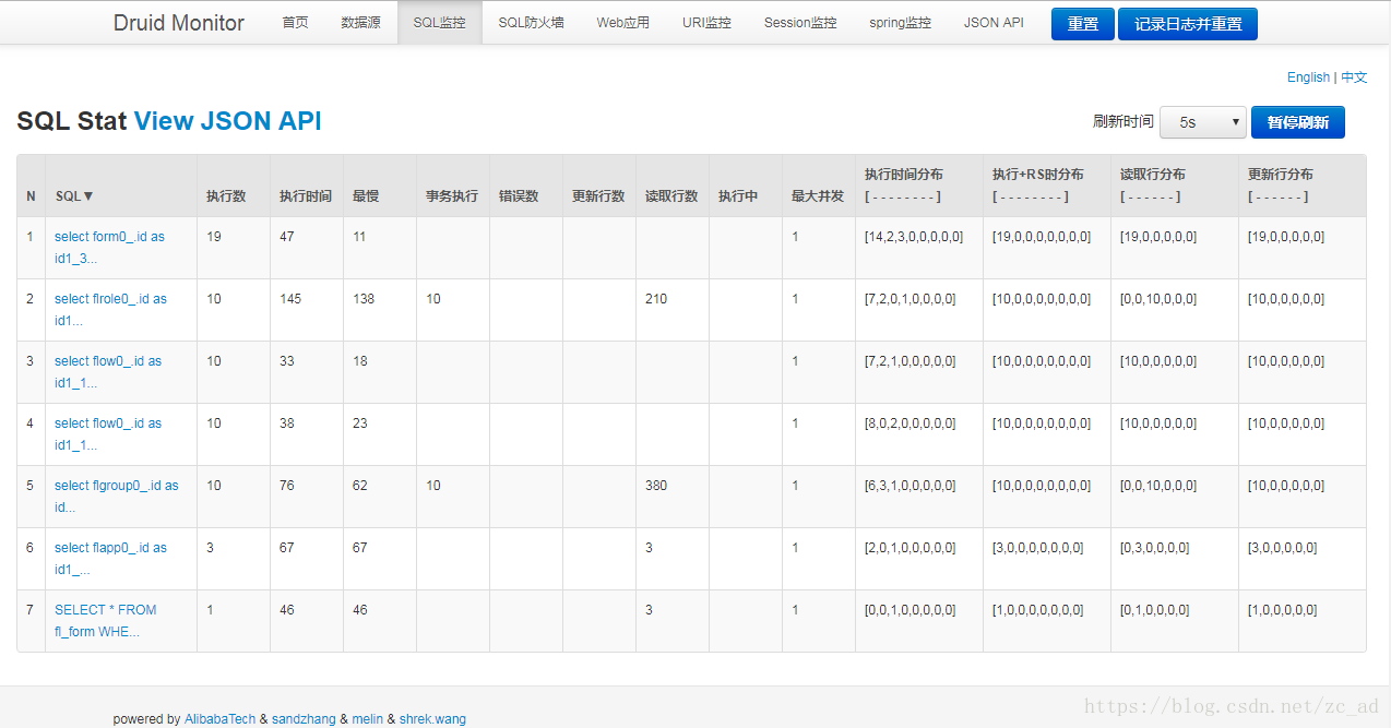本人对各种连接池了解的并不深入,也对各种连接池的效率停留在大佬们的口述中,偶尔一次机会遇到了durid,感觉它的监控界面是如此的强大,由此激发我整合durid的兴趣。durid的监控界面如下: