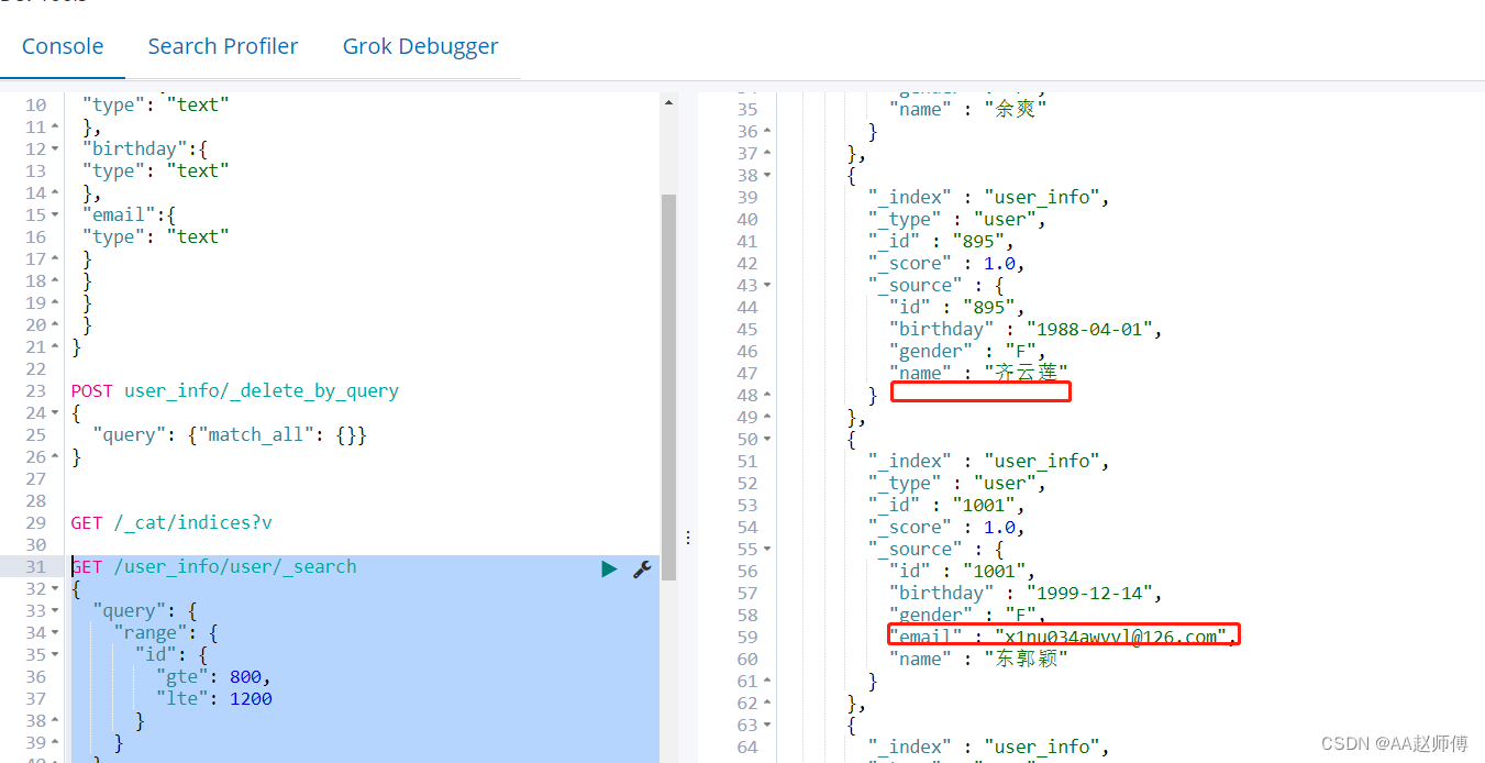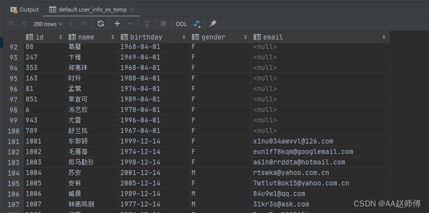 select id,name,birthday, gender,email from user_info_es_temp limit 100;