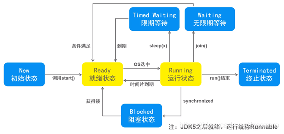 - TERMINATED:当线程执行完毕或被其它线程杀死,线程就进入死亡状态,这时线程不可能再进入就绪状态等待执行。