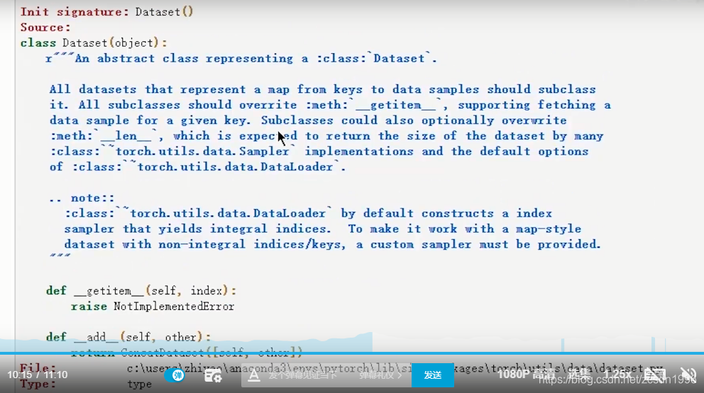 大致意思:Dataset是一个抽象类,所有的数据集(表示一个键到其数据样本的地图数据集)都要集成这个类,所有的子类都要重写__getitem__方法(获得每个数据及其对应的lable)。同时也可以选择去重写__len__类(长度类)