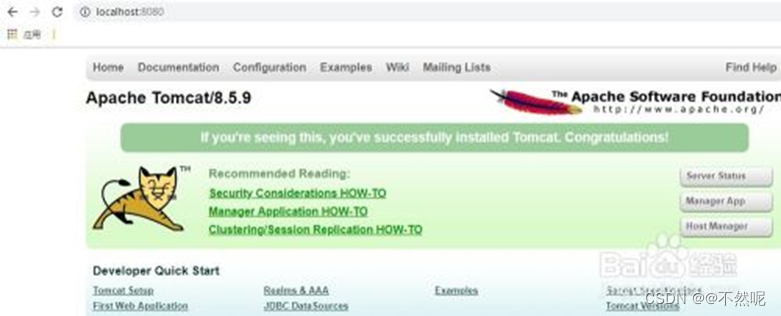 安装验证,在安装完毕且启动Apache Tomcat,通过浏览器访问tomcat的8080端口(第二步骤中设置的端口)。http://localhost:8080;如可以正常打开表明tomcat安装部署启动成功。可以通过启动安装目录下的startup.bat启动tomcat服务。