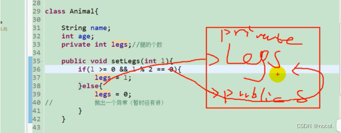 属性的封装:把leg属性定义为私有,从而使其他创造的对象不能直接调用。此外,在类中新建一个公共方法setleg,通过方法setleg在满足方法中条件的情况下才能调用leg属性。这种方法就叫做对legs的一个封装(或者叫隐藏)