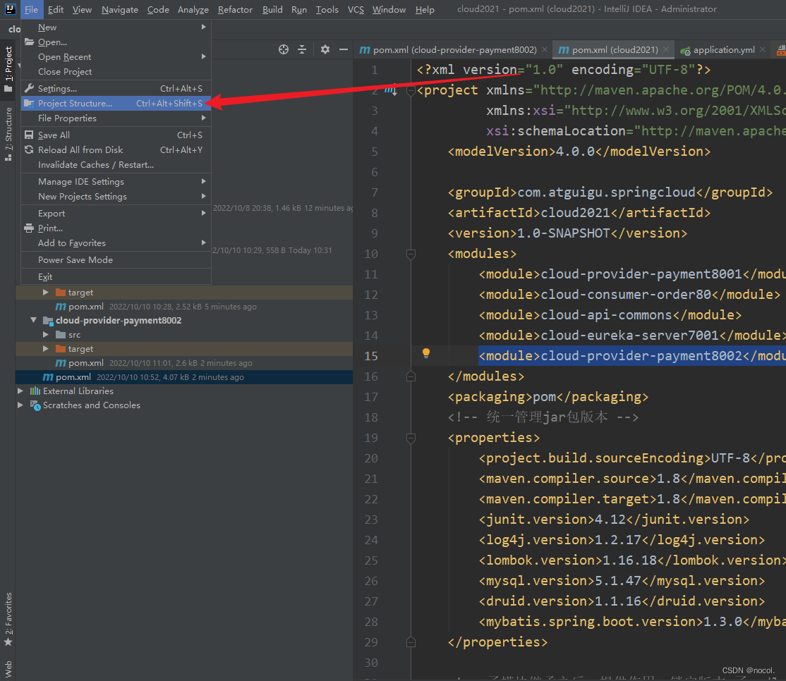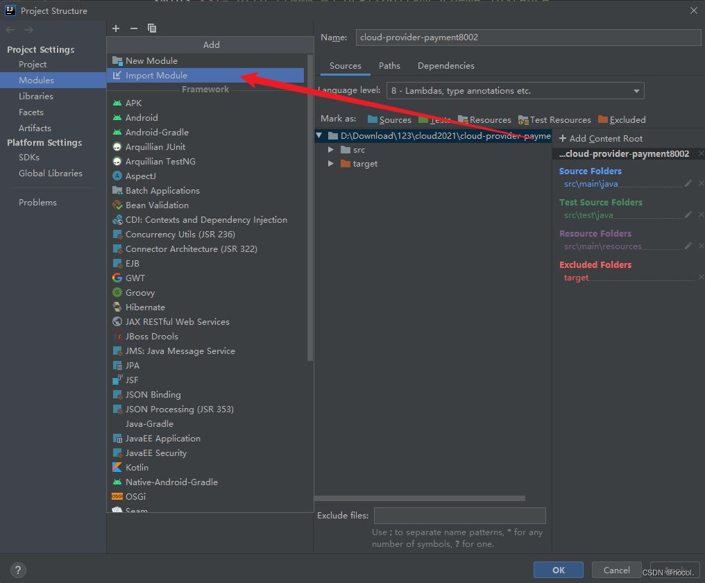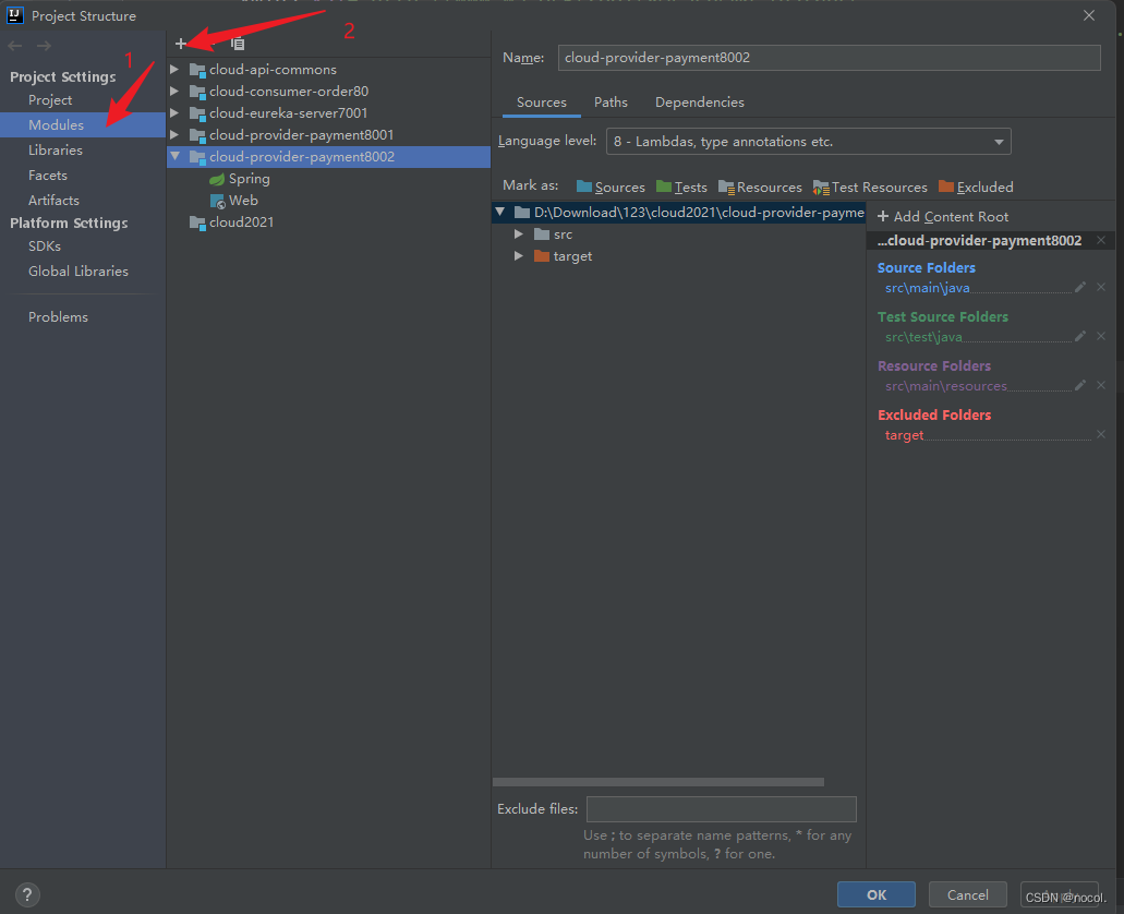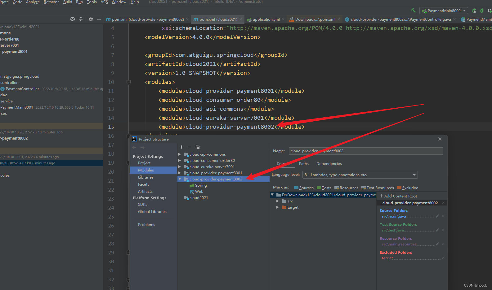 5.若主模块中未成功添加<module>cloud-provider-payment8002</module>,可通过此方式手动添加
