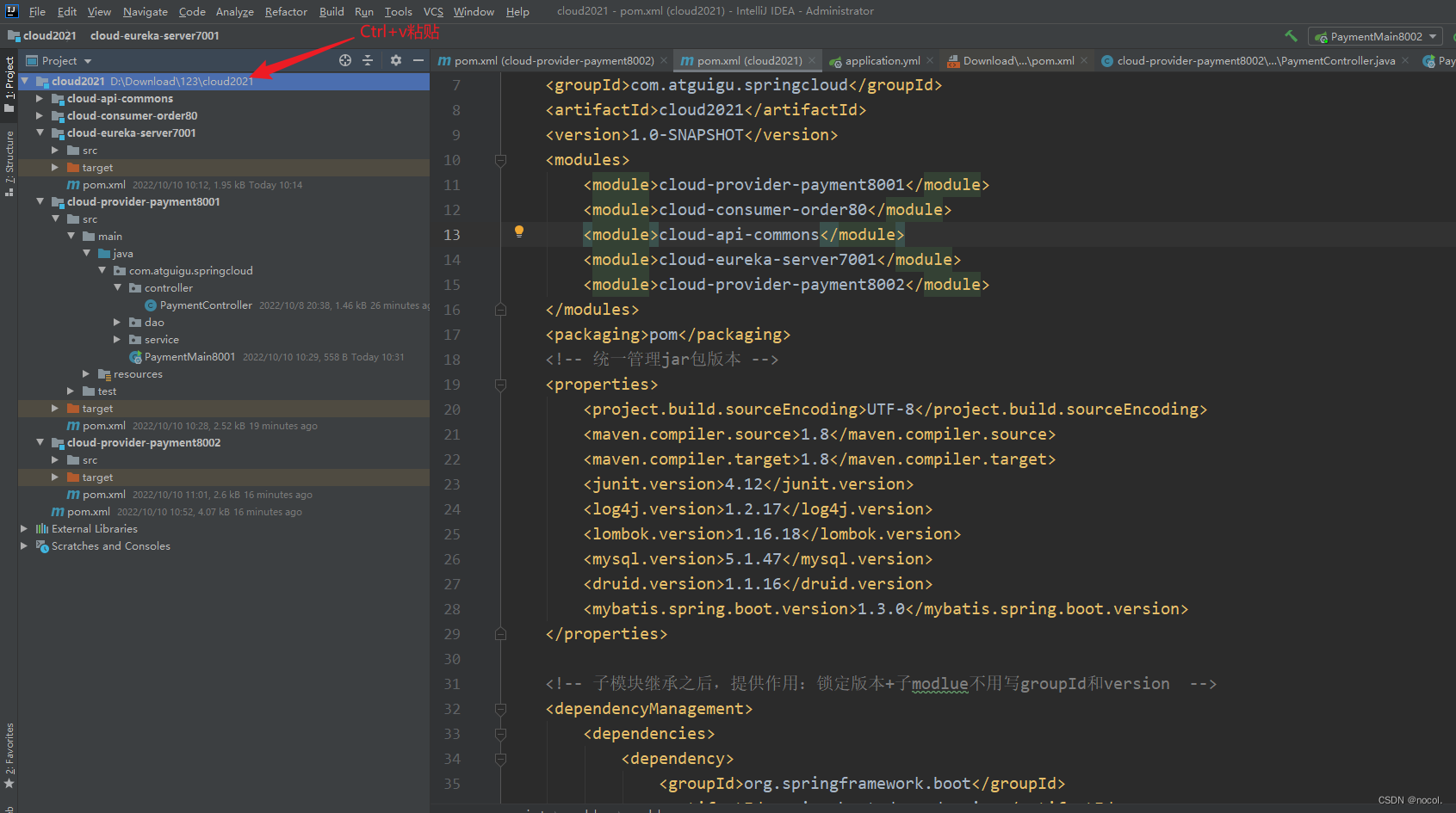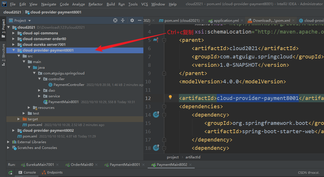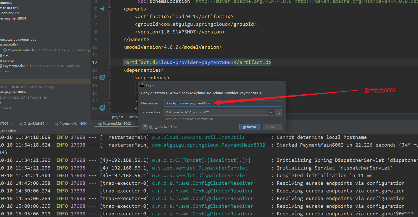1.首先ctrl +c复制cloud-provider-payment8001,然后在主模块下ctrl +v粘贴为副本,给副本改名cloud-provider-payment8002: