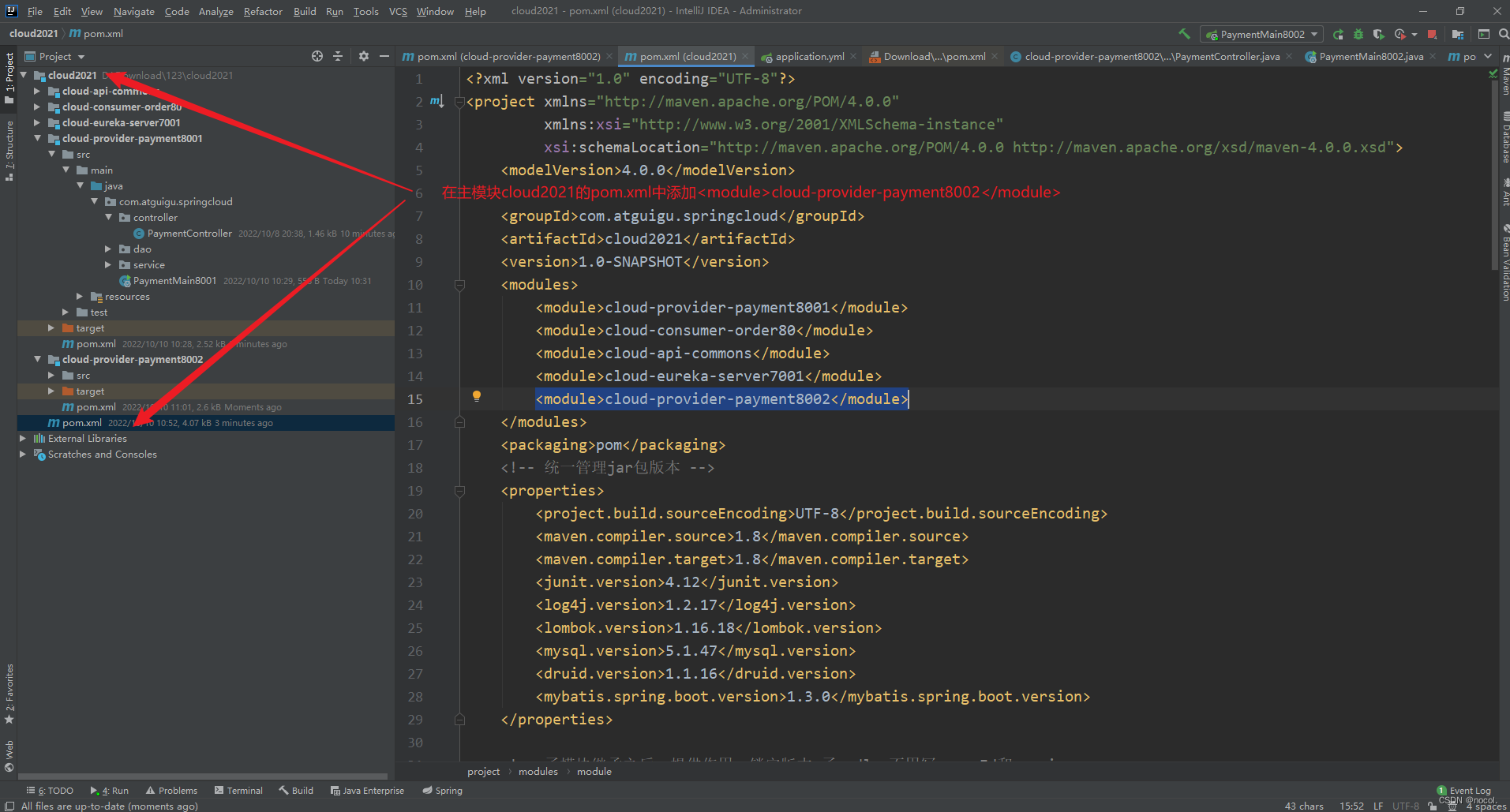 4.检查主模块的pom.xml,看是否已引入<module>cloud-provider-payment8002</module> 。再次确认名称一致后刷新Maven即可