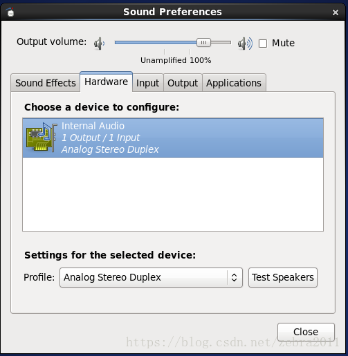 进入虚拟机的桌面环境,通过设置界面即可找到相应的声卡,我的是centos6.5操作系统,出来的声卡如下图所示: