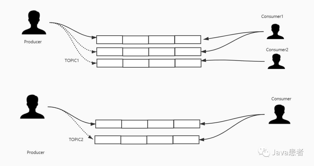 Producer向一些队列轮流发送消息,队列集合称为一个Topic,Consumer从队列中进行消费,如果Consumer做广播消费,则一个Consumer实例消费这个Topic对应的所有队列,Consumer如果做集群消费,则多个实例平均消费这个Topic对应的队列集合。