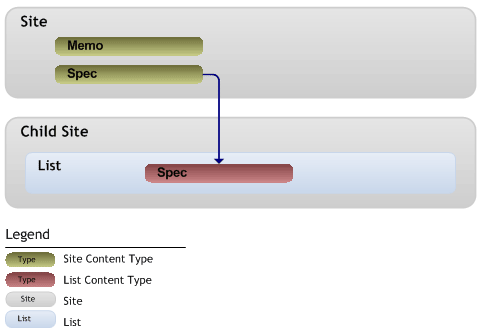 下图显示了这一关系。两个网站内容类型,备忘录(Memo)和规格(Spec),定义在某个网站中。当Spec内容类型被添加到子站点内的某列表中时, Windows SharePoint Services拷贝一个网站内容类型的实例到该列表中。